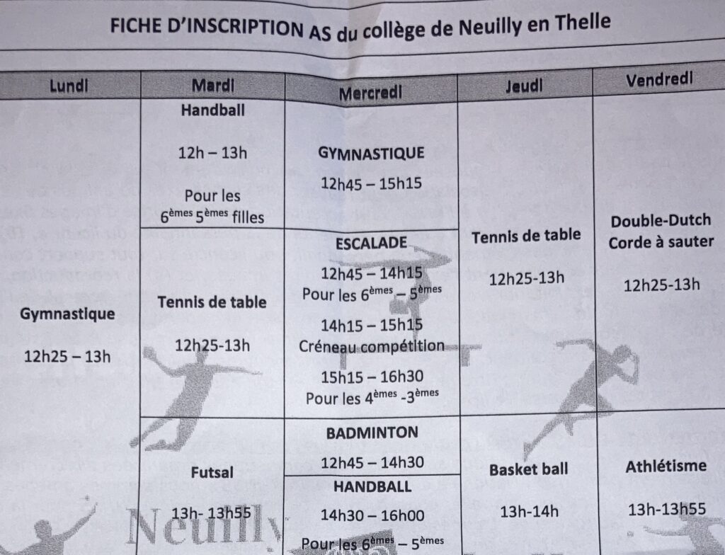 Accueil / Pour information / Club AS du collège Pour information Club AS du collège ParAPE Mis à jour le8 septembre 2023 Les professeurs d’EPS du collège accueillent vos enfants sur l’heure de table en semaine et le mercredi après-midi. La cotisation annuelle est de 25 euros.Plus d’infos auprès du professeur d’EPS de votre enfant.fiche-horaire-ASTélécharger